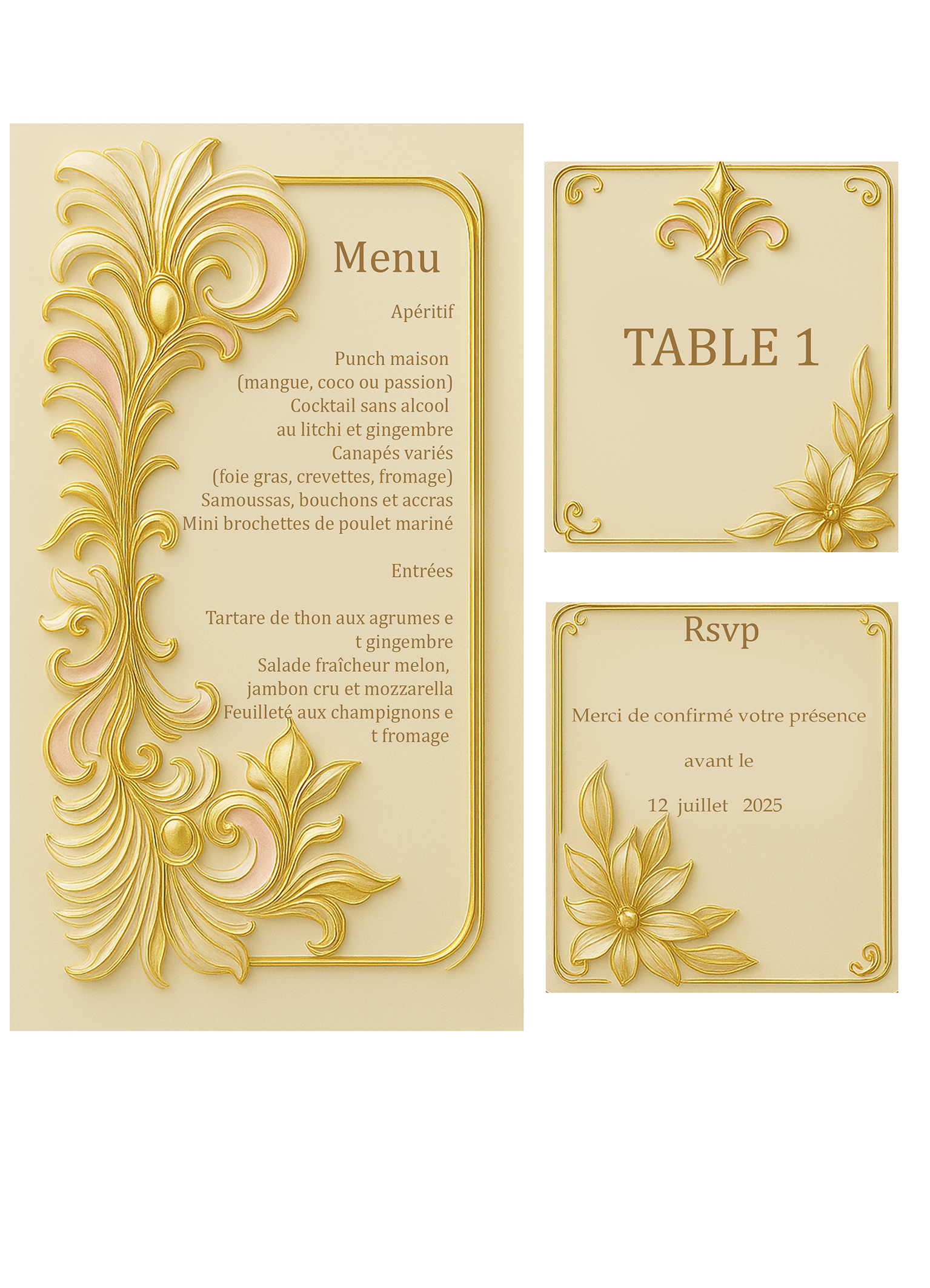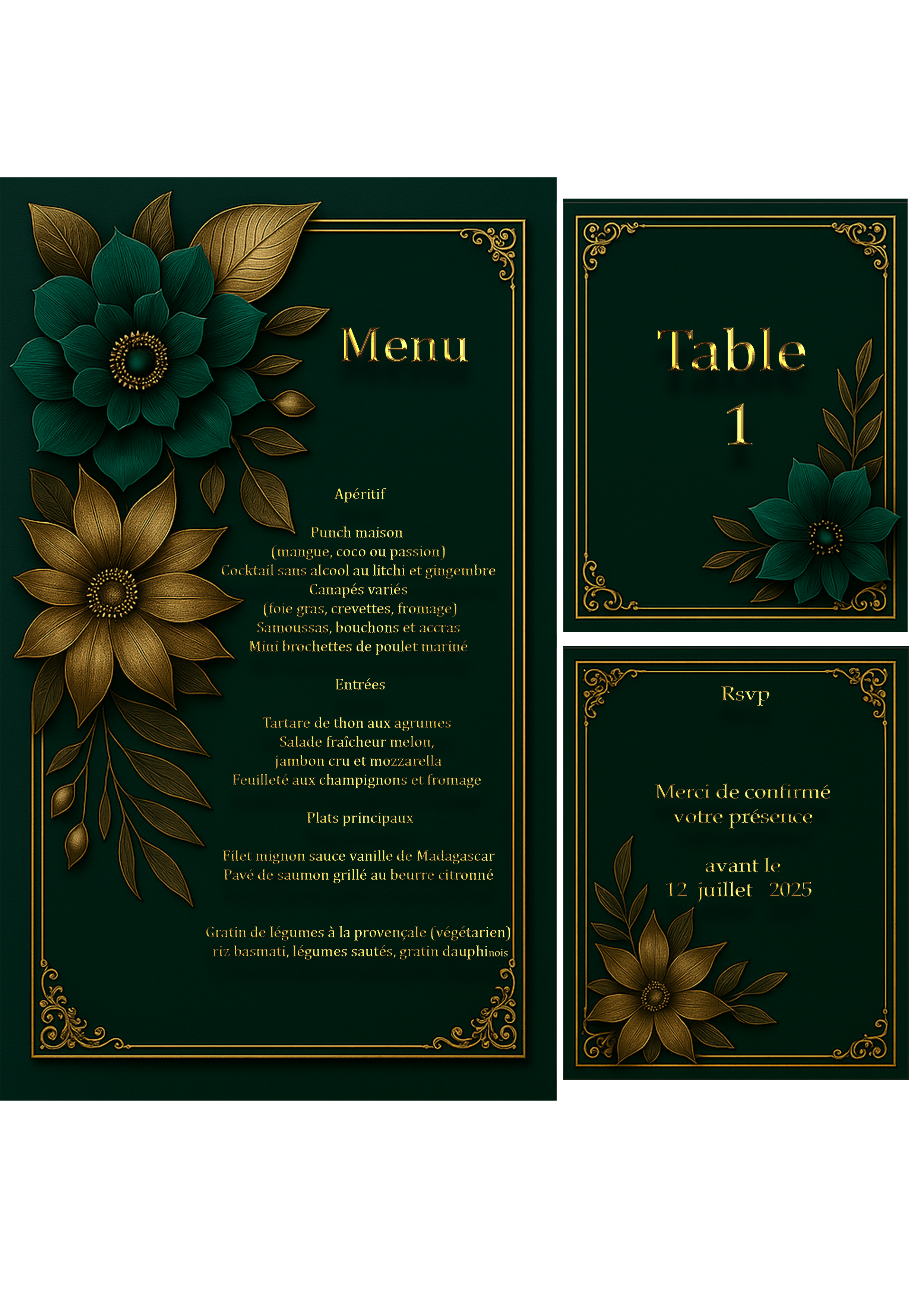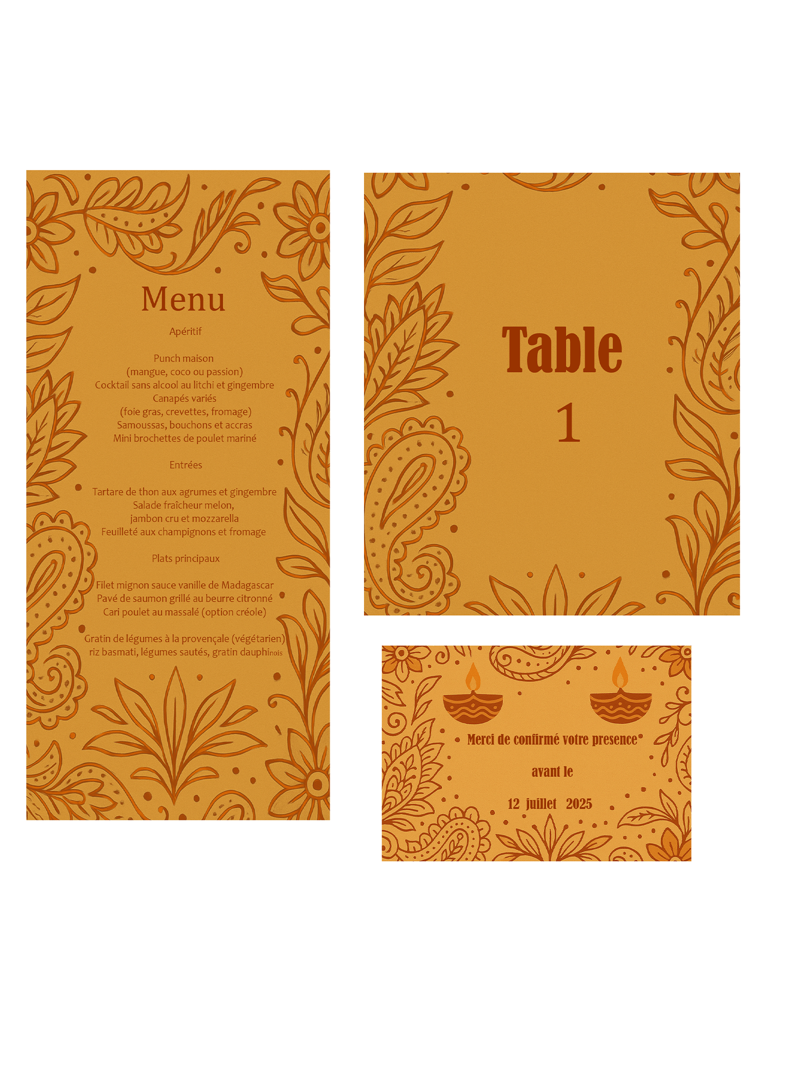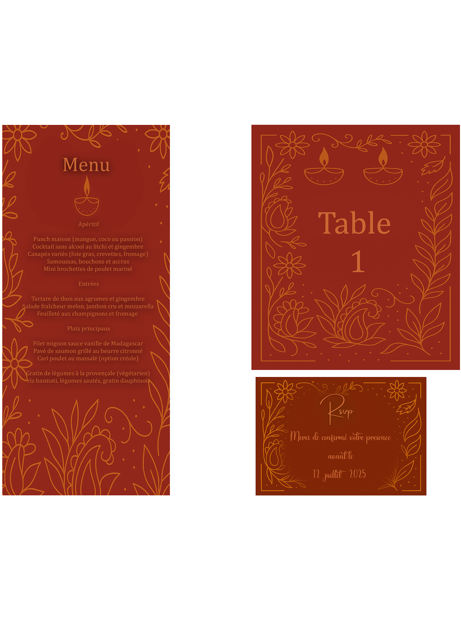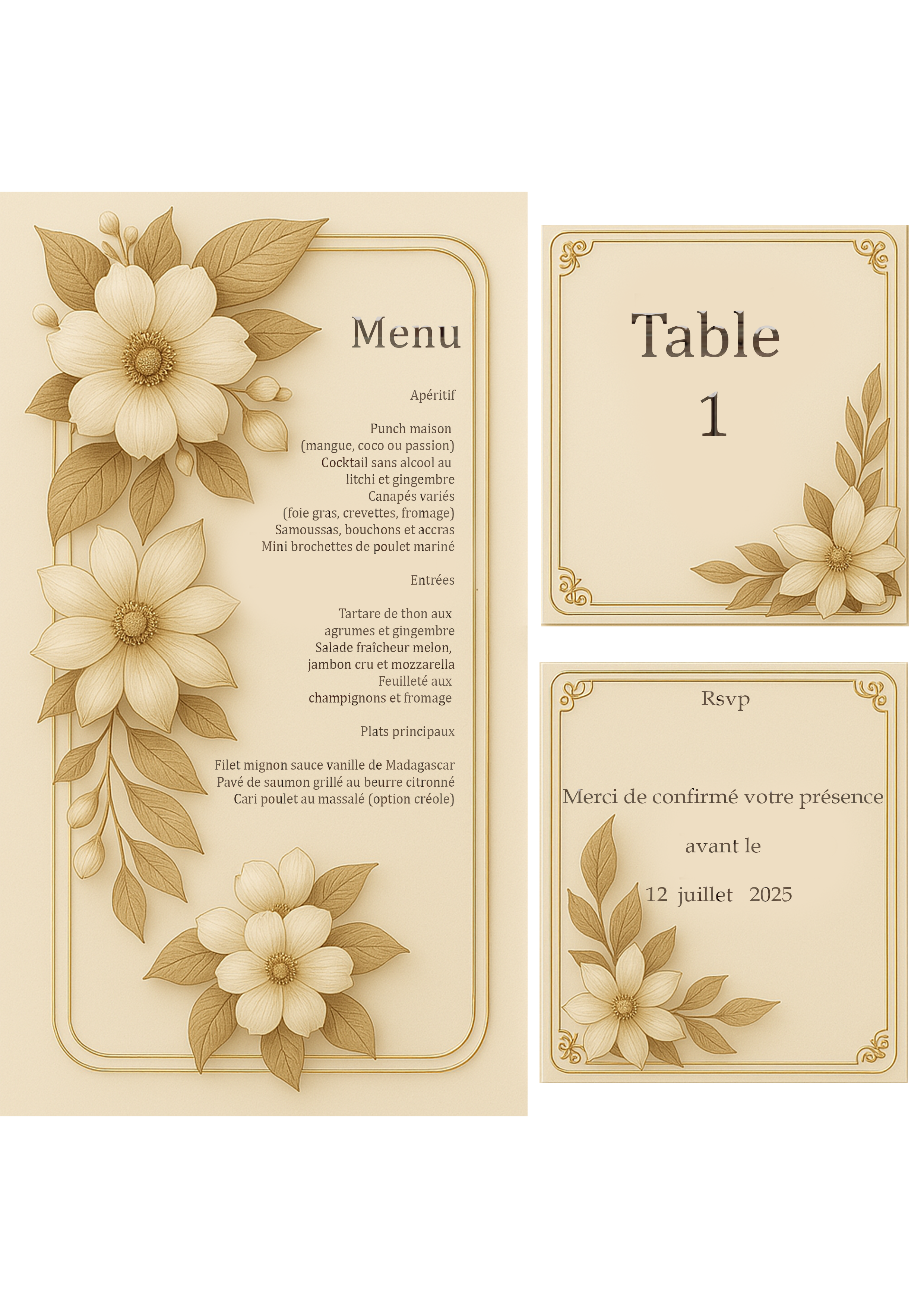 Choisissez parmi nos modèles de packs incluant faire-part, carte menu, carte réponse et plan de table. Tout est livré en version numérique, prêt à être personnalisé et envoyé !